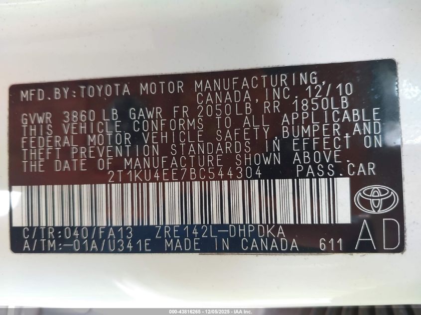 Колір БілийЦиліндри 4Привід Передній привідVIN 2T1KU4EE7BC544304Стан СтаціонарноУшкодження Задня права
