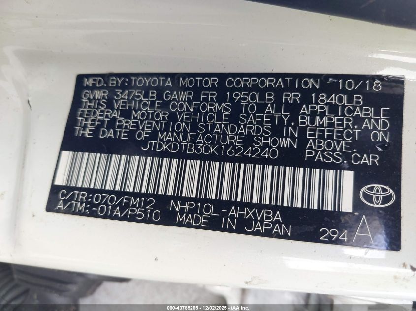 2019 TOYOTA PRIUS C 2019 року Гібрид, 1.5, Передній привід, vin - JTDKDTB30K1624240 з США