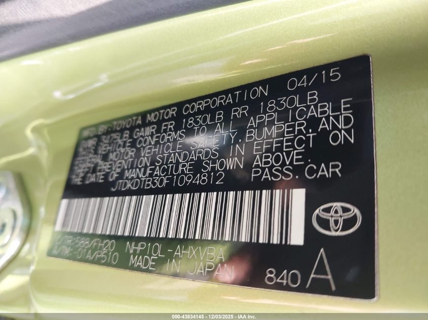 2015 TOYOTA PRIUS C 2015 року Гібрид, 1.5, Передній привід, vin - JTDKDTB30F1094812 з США