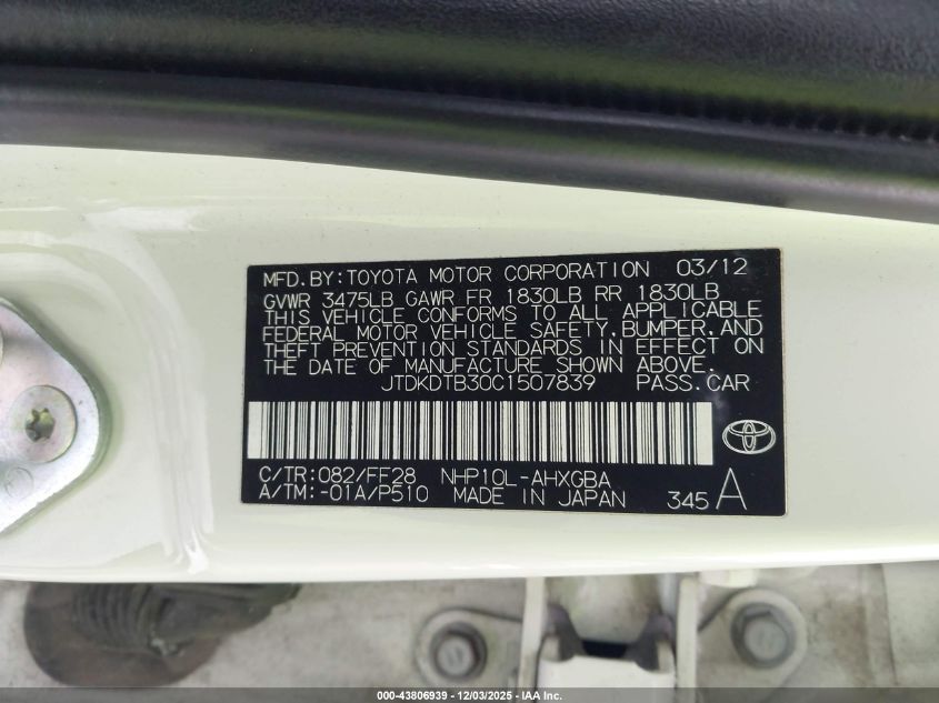 2012 TOYOTA PRIUS C 2012 року Гібрид, 1.5, Передній привід, vin - JTDKDTB30C1507839 з США
