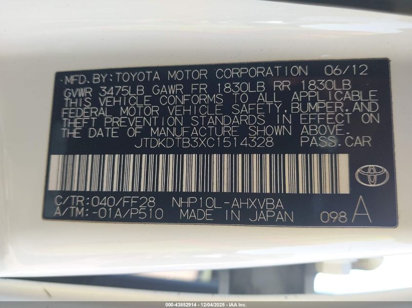 2012 TOYOTA PRIUS C 2012 року Гібрид, 1.5, Передній привід, vin - JTDKDTB3XC1514328 з США