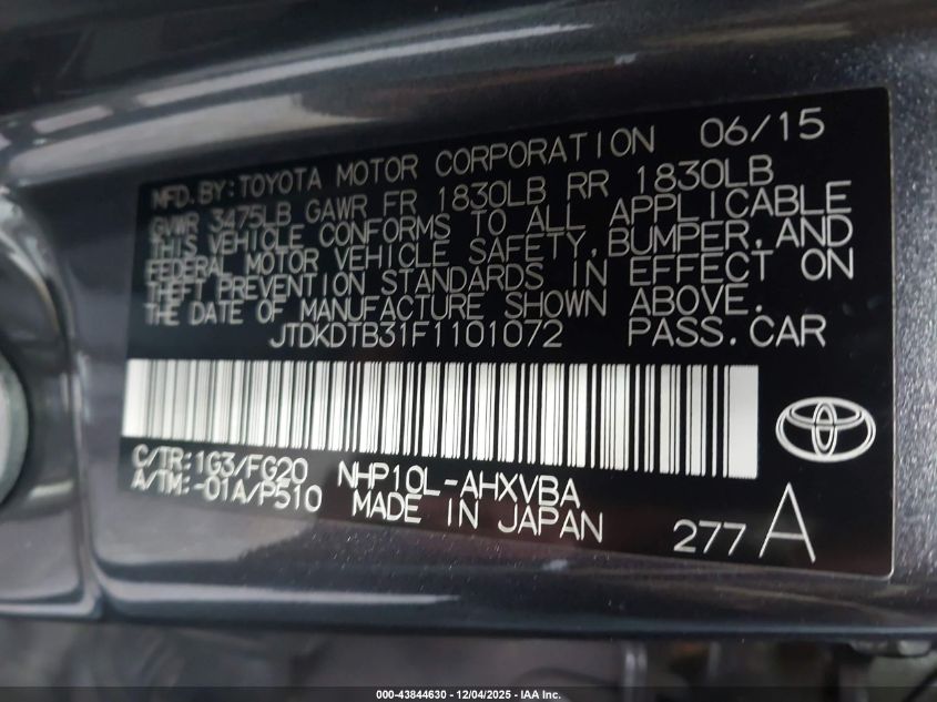 2015 TOYOTA PRIUS C 2015 року Гібрид, 1.5, Передній привід, vin - JTDKDTB31F1101072 з США