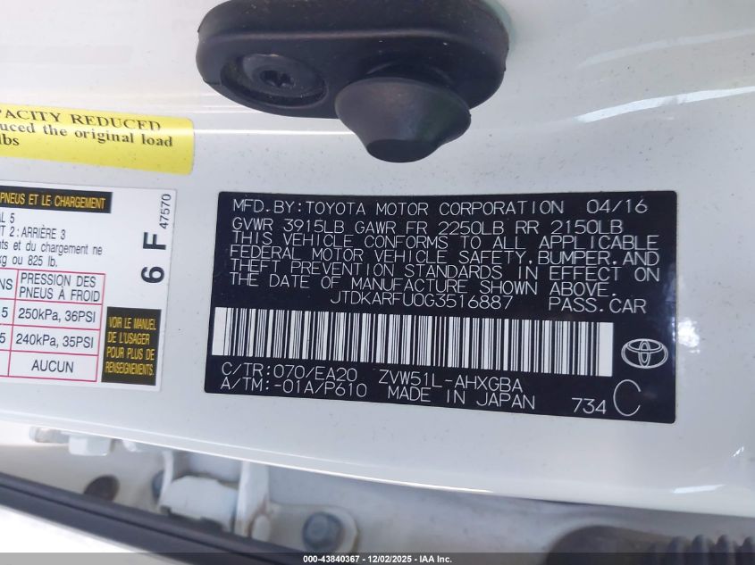 2016 TOYOTA PRIUS 2016 року Гібрид, 1.8, Передній привід, vin - JTDKARFU0G3516887 з США