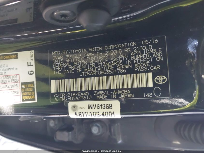 2016 TOYOTA PRIUS 2016 року Гібрид, 1.8, Передній привід, vin - JTDKARFU8G3521786 з США