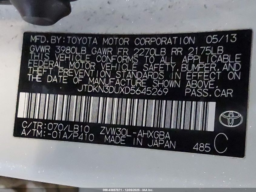 Колір БілийЦиліндри 4Привід Передній привідVIN JTDKN3DUXD5645269Стан СтаціонарноУшкодження Передня ліва AutoRIA