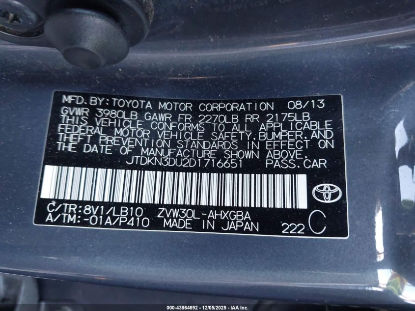 2013 TOYOTA PRIUS 2013 року Гібрид, 1.8, Передній привід, vin - JTDKN3DU2D1716651 з США