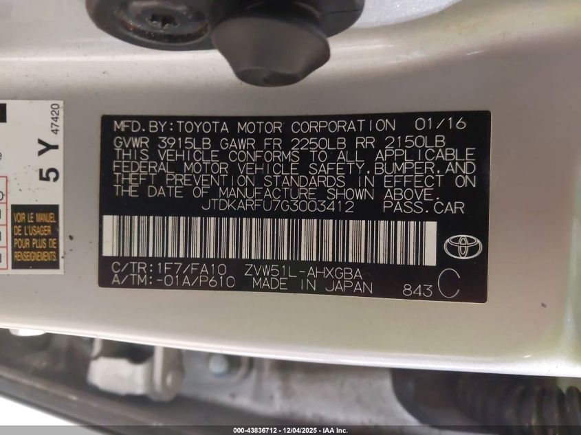 2016 TOYOTA PRIUS 2016 року Гібрид, 1.8, Передній привід, vin - JTDKARFU7G3003412 з США