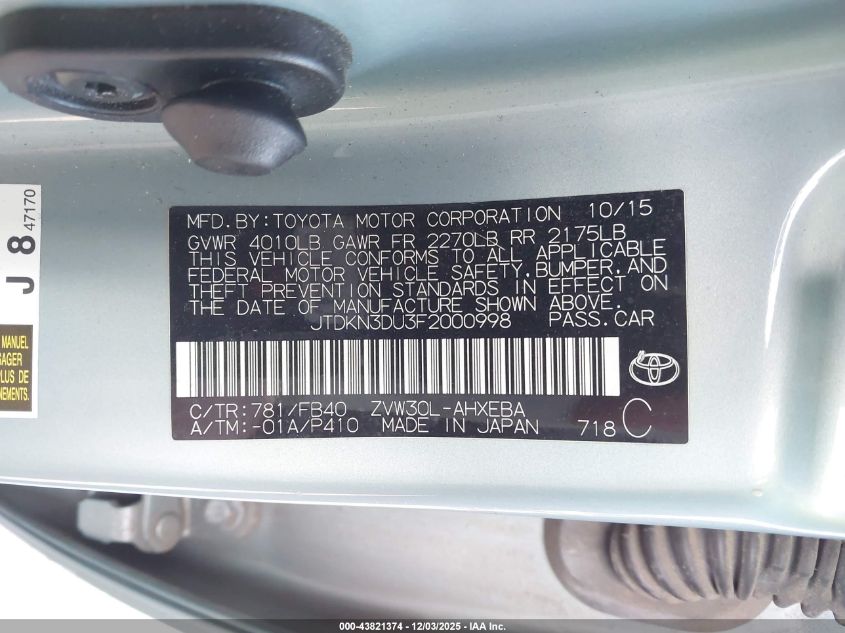 Колір СинійЦиліндри 4Привід Передній привідVIN JTDKN3DU3F2000998Стан СтаціонарноУшкодження Передня або задня AutoRIA
