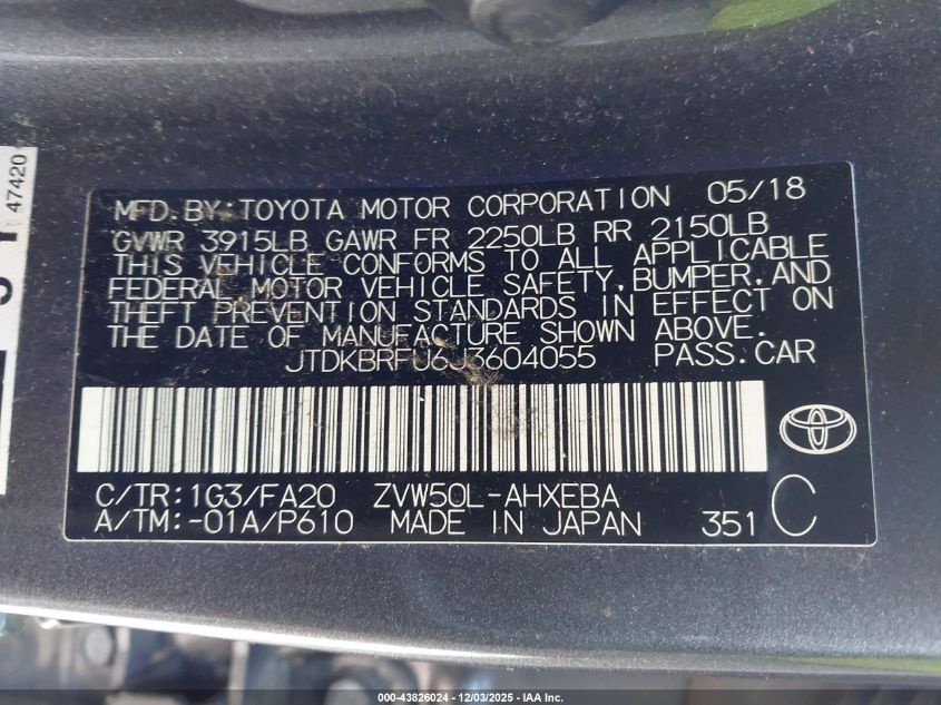 2018 TOYOTA PRIUS 2018 року Гібрид, 1.8, Передній привід, vin - JTDKBRFU6J3604055 з США