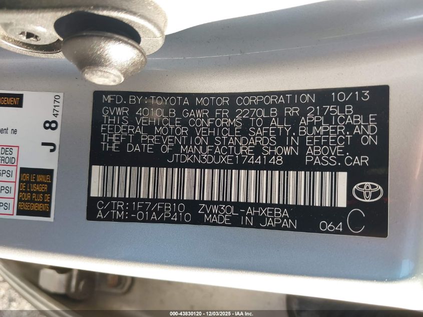 2014 TOYOTA PRIUS 2014 року Гібрид, 1.8, Передній привід, vin - JTDKN3DUXE1744148 з США