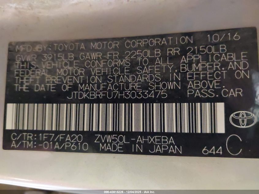Колір СірийЦиліндри 4Привід Передній привідVIN JTDKBRFU7H3033475Стан СтаціонарноУшкодження Передня або задня AutoRIA