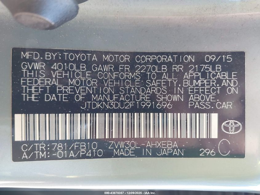 2015 TOYOTA PRIUS 2015 року Гібрид, 1.8, Передній привід, vin - JTDKN3DU2F1991696 з США