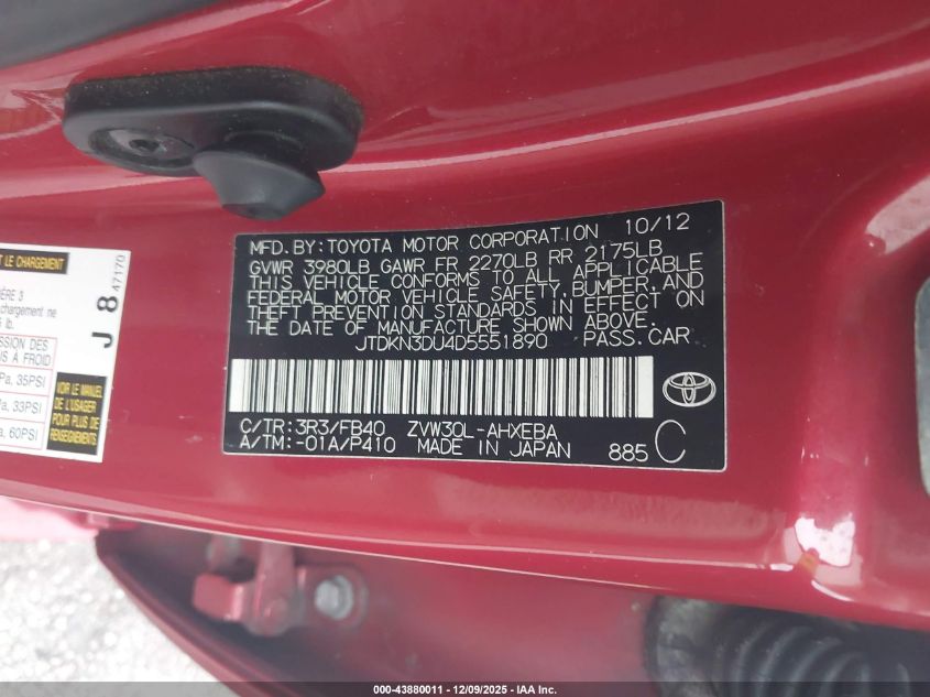 Колір ЧервонийЦиліндри 4Привід Передній привідVIN JTDKN3DU4D5551890Стан Заводиться та їде (перевірено)Ушкодження ХодоваДата аукціону 2025-12-18 AutoRIA
