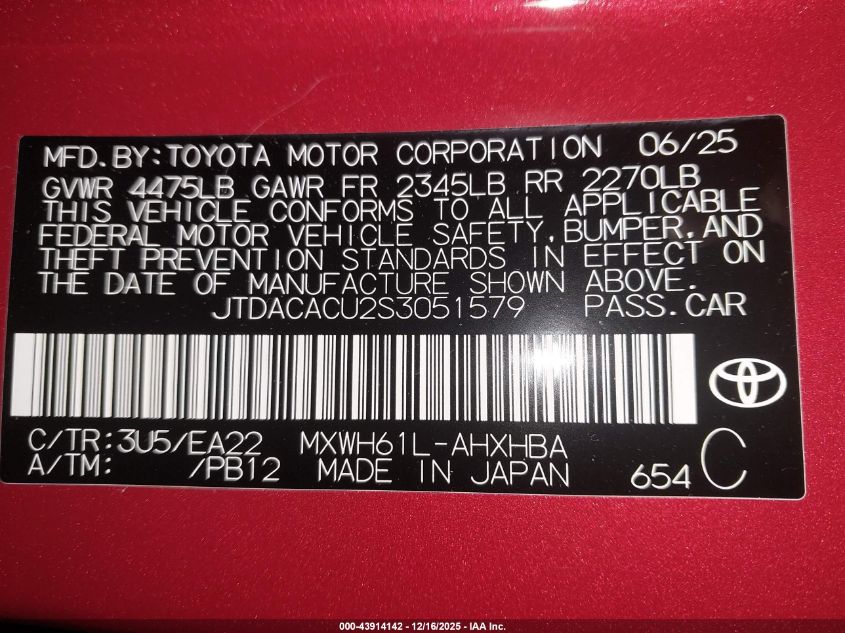 2025 TOYOTA PRIUS 2025 року Гібрид, 2.0, Передній привід, vin - JTDACACU2S3051579 з США