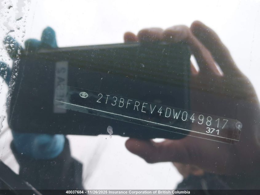Колір СинійЦиліндри 4Привід Повний привідVIN 2T3BFREV4DW049817Стан Заводиться та їде (перевірено)Ушкодження Ліва сторонаДата аукціону 2025-12-08 AutoRIA