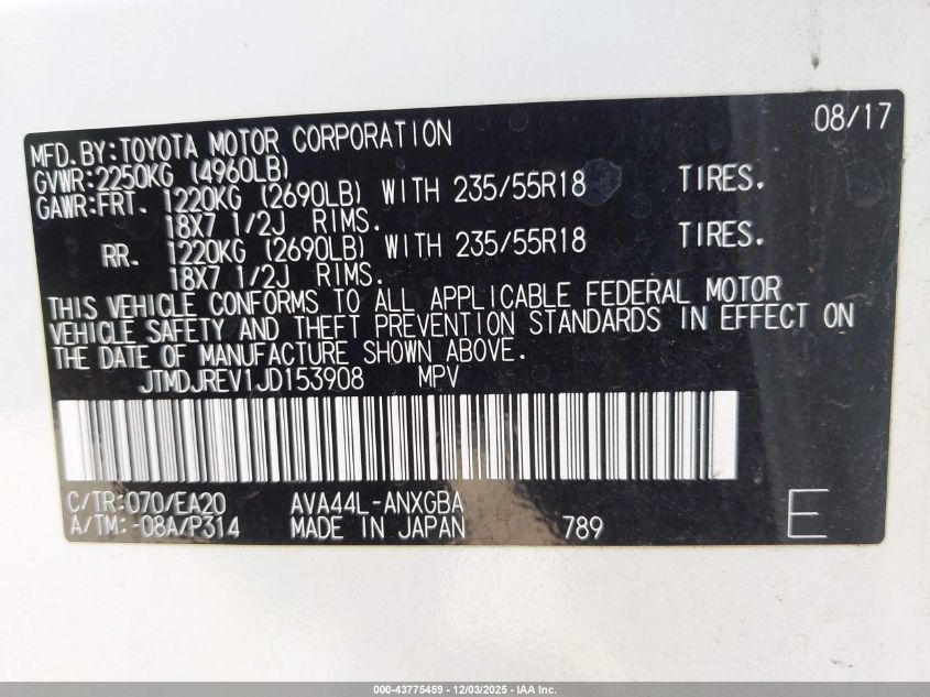 Колір БілийЦиліндри 4Привід Повний привідVIN JTMDJREV1JD153908Стан Заводиться та їде (перевірено)Ушкодження Дах AutoRIA