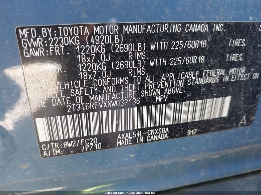 Колір СинійЦиліндри 4Привід Повний привідVIN 2T3T6RFVXNW032136Стан Заводиться та їде (перевірено)Ушкодження Задня AutoRIA