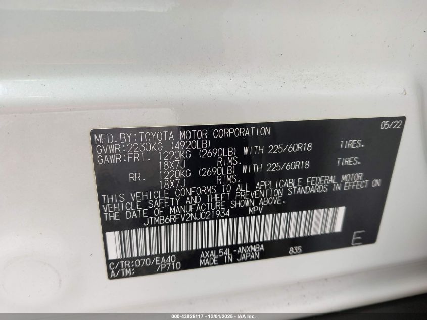 2022 TOYOTA RAV4 HYBRID 2022 року Гібрид, 2.5, Повний привід, vin - JTMB6RFV2NJ021934 з США