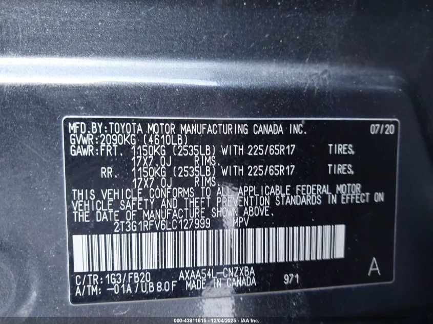 2020 TOYOTA RAV4 2020 року Бензин, 2.5, Повний привід, vin - 2T3G1RFV6LC127999 з США