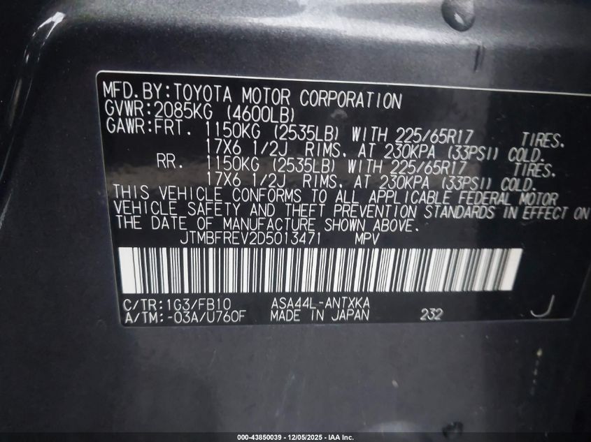 Колір СірийЦиліндри 4Привід Повний привідVIN JTMBFREV2D5013471Стан Заводиться та їде (перевірено)Ушкодження Передня ліва AutoRIA