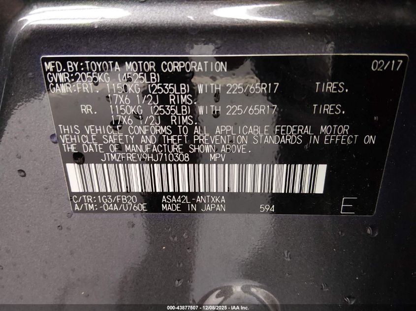 2017 TOYOTA RAV4 2017 року Бензин, 2.5, Передній привід, vin - JTMZFREV9HJ710308 з США