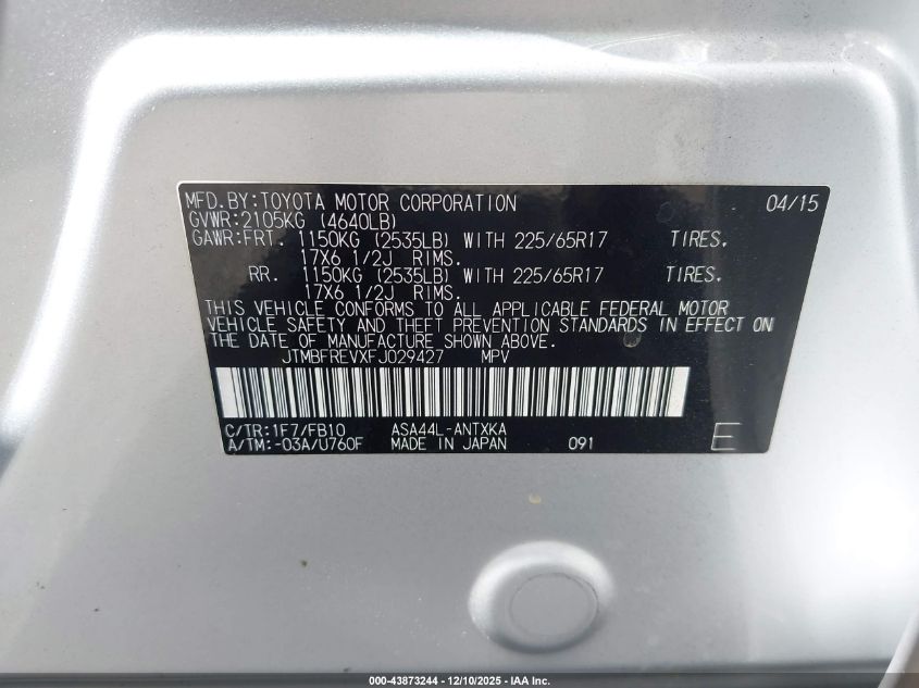 2015 TOYOTA RAV4 2015 року Бензин, 2.5, Повний привід, vin - JTMBFREVXFJ029427 з США
