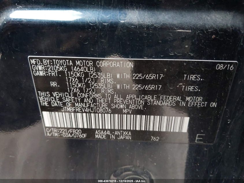 2017 TOYOTA RAV4 2017 року Бензин, 2.5, Повний привід, vin - JTMBFREV4HJ108076 з США