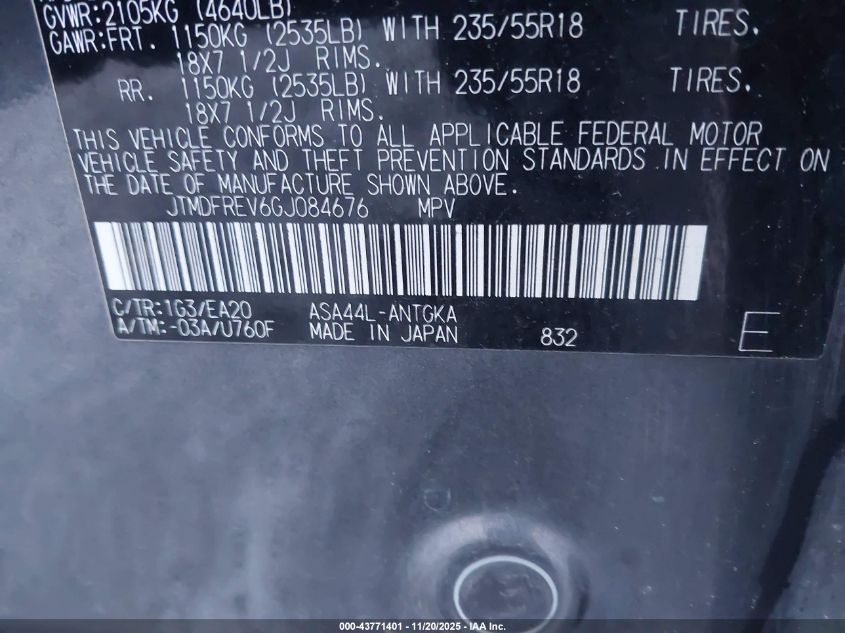Колір СірийЦиліндри 4Привід Повний привідVIN JTMDFREV6GJ084676Стан СтаціонарноУшкодження Звичайний зносДата аукціону 2025-12-12 AutoRIA