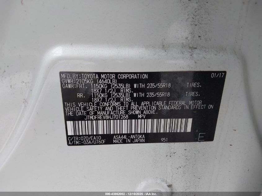 Колір БілийЦиліндри 4Привід Повний привідVIN JTMDFREV8HJ701268Стан Заводиться та їде (перевірено)Ушкодження Передня права AutoRIA