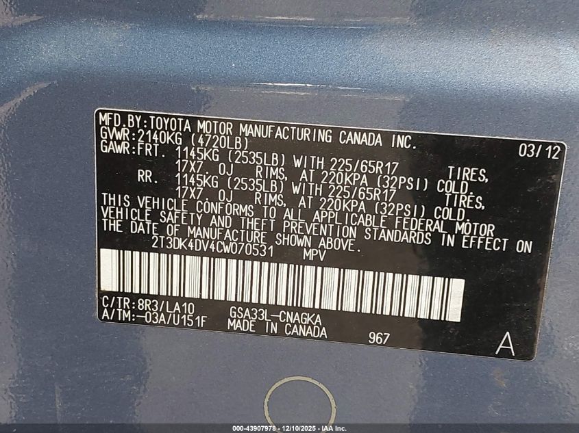 2012 TOYOTA RAV4 2012 року Бензин, 3.5, Повний привід, vin - 2T3DK4DV4CW070531 з США