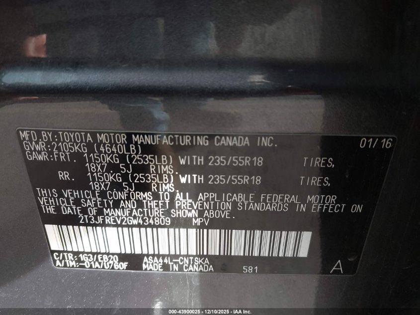 2016 TOYOTA RAV4 2016 року Бензин, 2.5, Повний привід, vin - 2T3JFREV2GW434809 з США