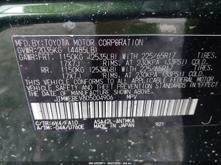 Колір ЗеленийЦиліндри 4Привід Передній привідVIN JTMWFREV8D5004906Стан Заводиться та їде (перевірено)Ушкодження Ліва сторона AutoRIA