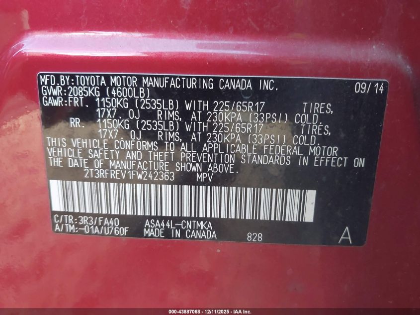 2015 TOYOTA RAV4 2015 року Бензин, 2.5, Повний привід, vin - 2T3RFREV1FW242363 з США