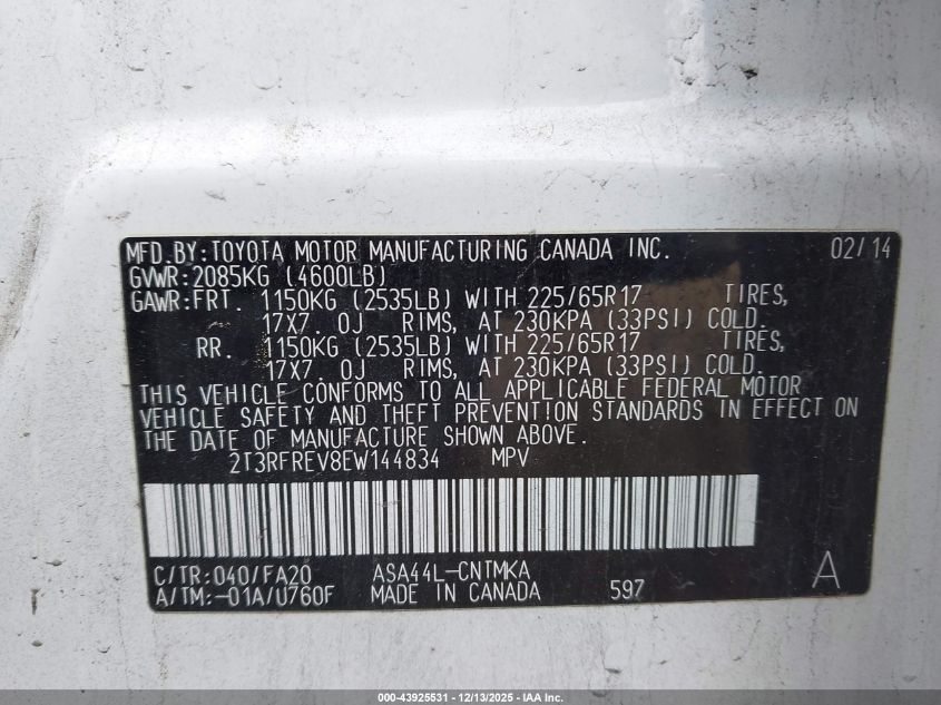 2014 TOYOTA RAV4 2014 року Бензин, 2.5, Повний привід, vin - 2T3RFREV8EW144834 з США