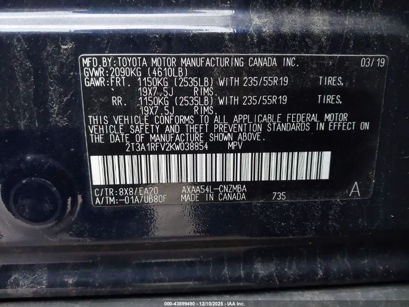 2019 TOYOTA RAV4 2019 року Бензин, 2.5, Повний привід, vin - 2T3A1RFV2KW038854 з США