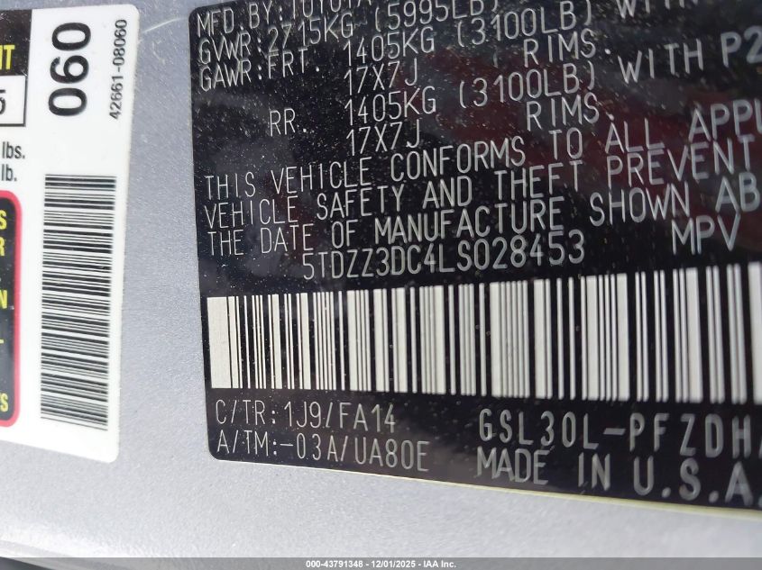 2020 TOYOTA SIENNA 2020 року Бензин, 3.5, Передній привід, vin - 5TDZZ3DC4LS028453 з США