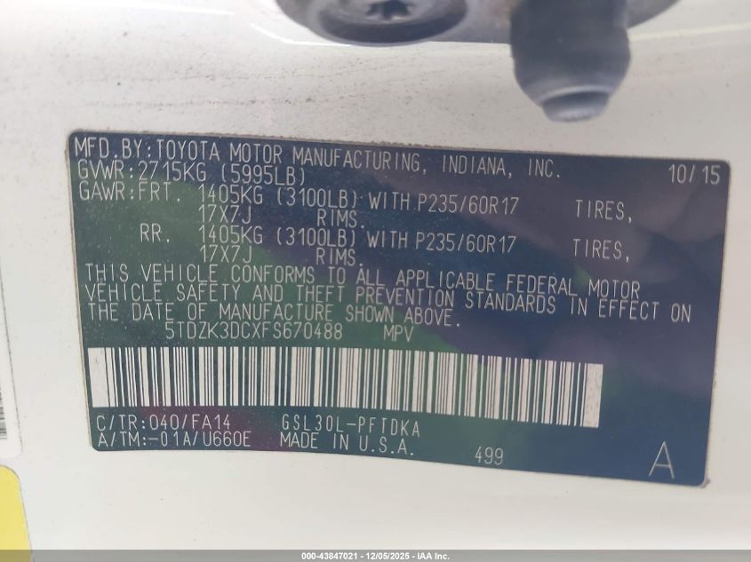 2015 TOYOTA SIENNA 2015 року Бензин, 3.5, Передній привід, vin - 5TDZK3DCXFS670488 з США