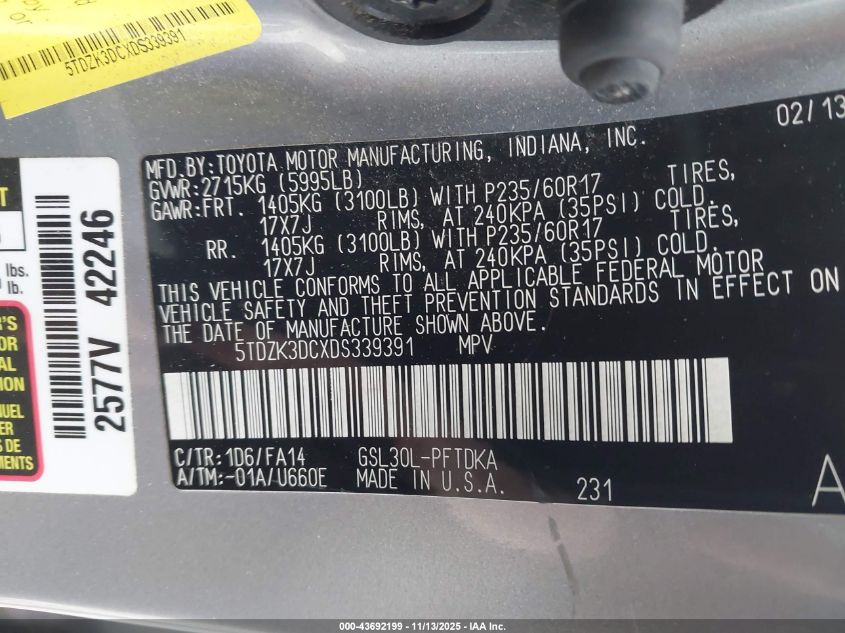 2013 TOYOTA SIENNA 2013 року Бензин, 3.5, Передній привід, vin - 5TDZK3DCXDS339391 з США