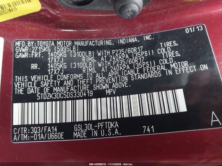 2013 TOYOTA SIENNA 2013 року Бензин, 3.5, Передній привід, vin - 5TDZK3DC5DS330419 з США