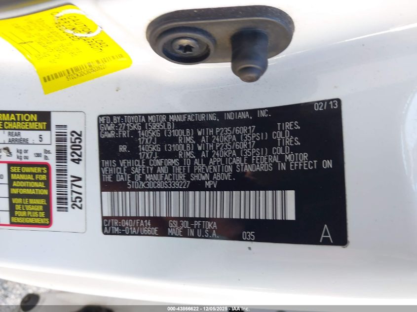 2013 TOYOTA SIENNA 2013 року Бензин, 3.5, Передній привід, vin - 5TDZK3DC8DS339227 з США