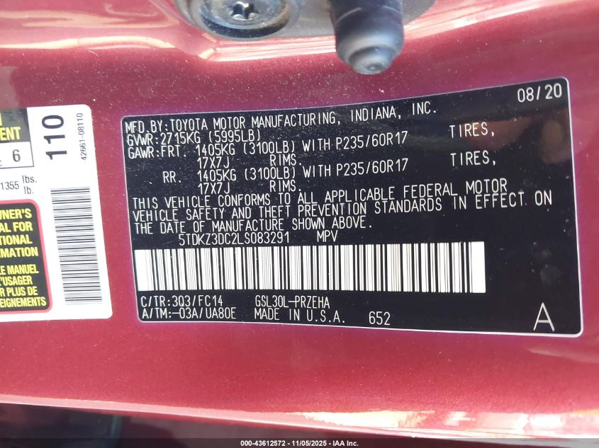 2020 TOYOTA SIENNA 2020 року Бензин, 3.5, Передній привід, vin - 5TDKZ3DC2LS083291 з США