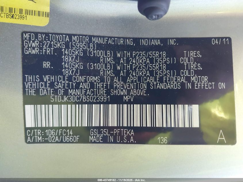 2011 TOYOTA SIENNA 2011 року Бензин, 3.5, Повний привід, vin - 5TDJK3DC7BS023991 з США
