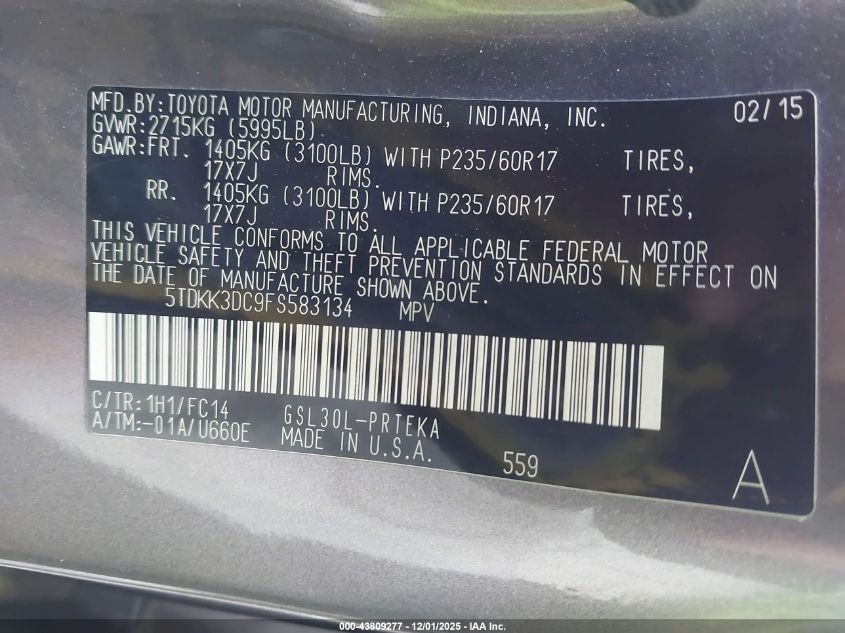 2015 TOYOTA SIENNA 2015 року Бензин, 3.5, Передній привід, vin - 5TDKK3DC9FS583134 з США