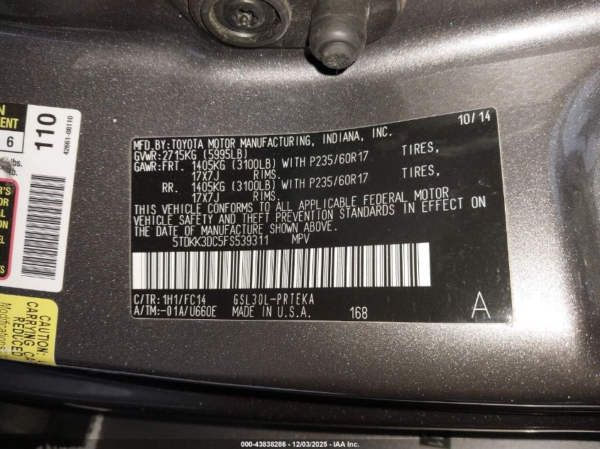 2015 TOYOTA SIENNA 2015 року Бензин, 3.5, Передній привід, vin - 5TDKK3DC5FS539311 з США