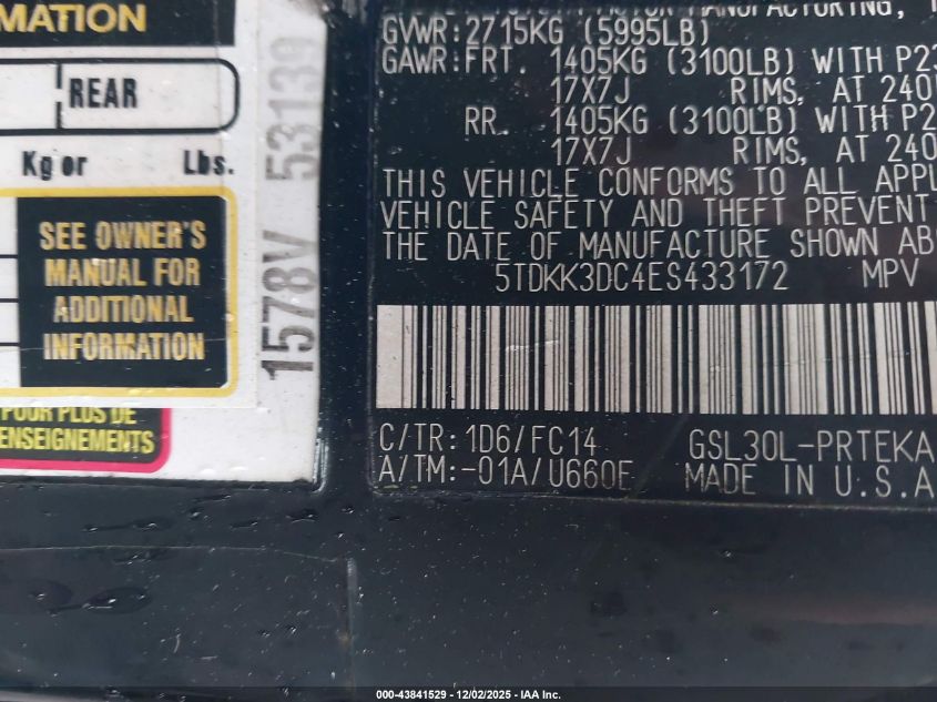 Колір ЧорнийЦиліндри 6Привід Передній привідVIN 5TDKK3DC4ES433172Стан Заводиться та їде (перевірено)Ушкодження ЗадняДата аукціону 2025-12-09 AutoRIA