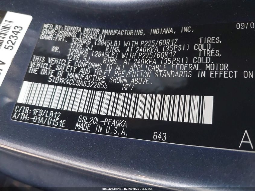Колір СірийЦиліндри 6Привід Передній привідVIN 5TDYK4CC9AS322855Стан Заводиться та їде (перевірено)Ушкодження Права сторонаДата аукціону 2025-12-09 AutoRIA