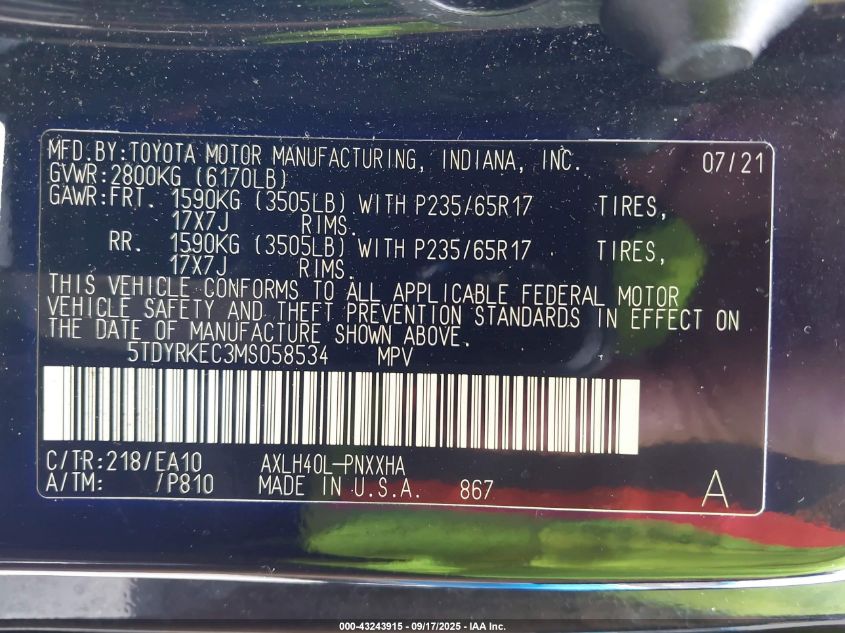 2021 TOYOTA SIENNA 2021 року Гібрид, 2.5, Передній привід, vin - 5TDYRKEC3MS058534 з США