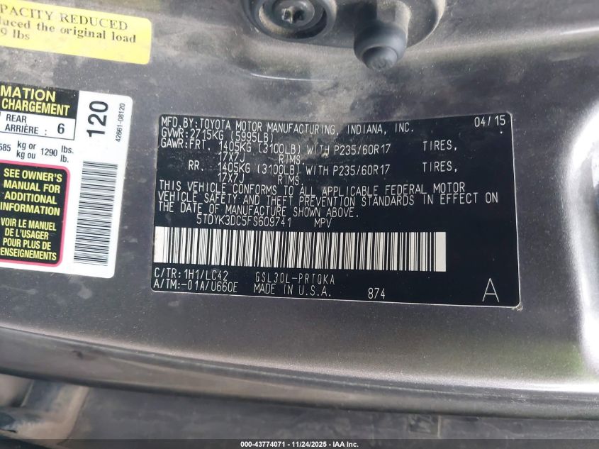 2015 TOYOTA SIENNA 2015 року Бензин, 3.5, Передній привід, vin - 5TDYK3DC5FS609741 з США