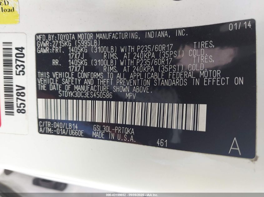 2014 TOYOTA SIENNA 2014 року Бензин, 3.5, Передній привід, vin - 5TDYK3DC3ES450586 з США