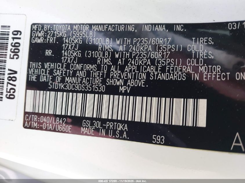 2013 TOYOTA SIENNA 2013 року Бензин, 3.5, Передній привід, vin - 5TDYK3DC9DS351530 з США